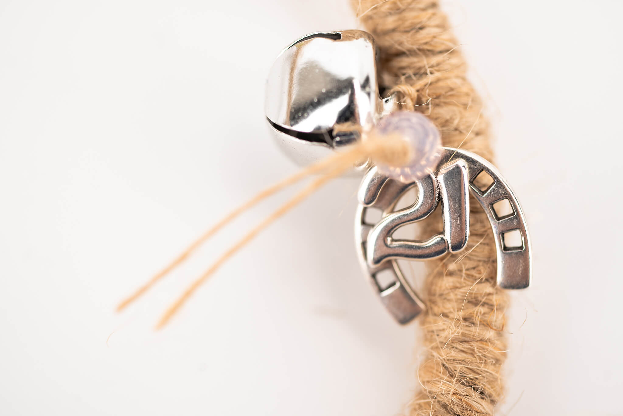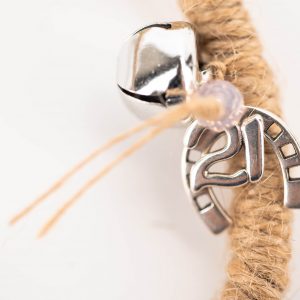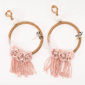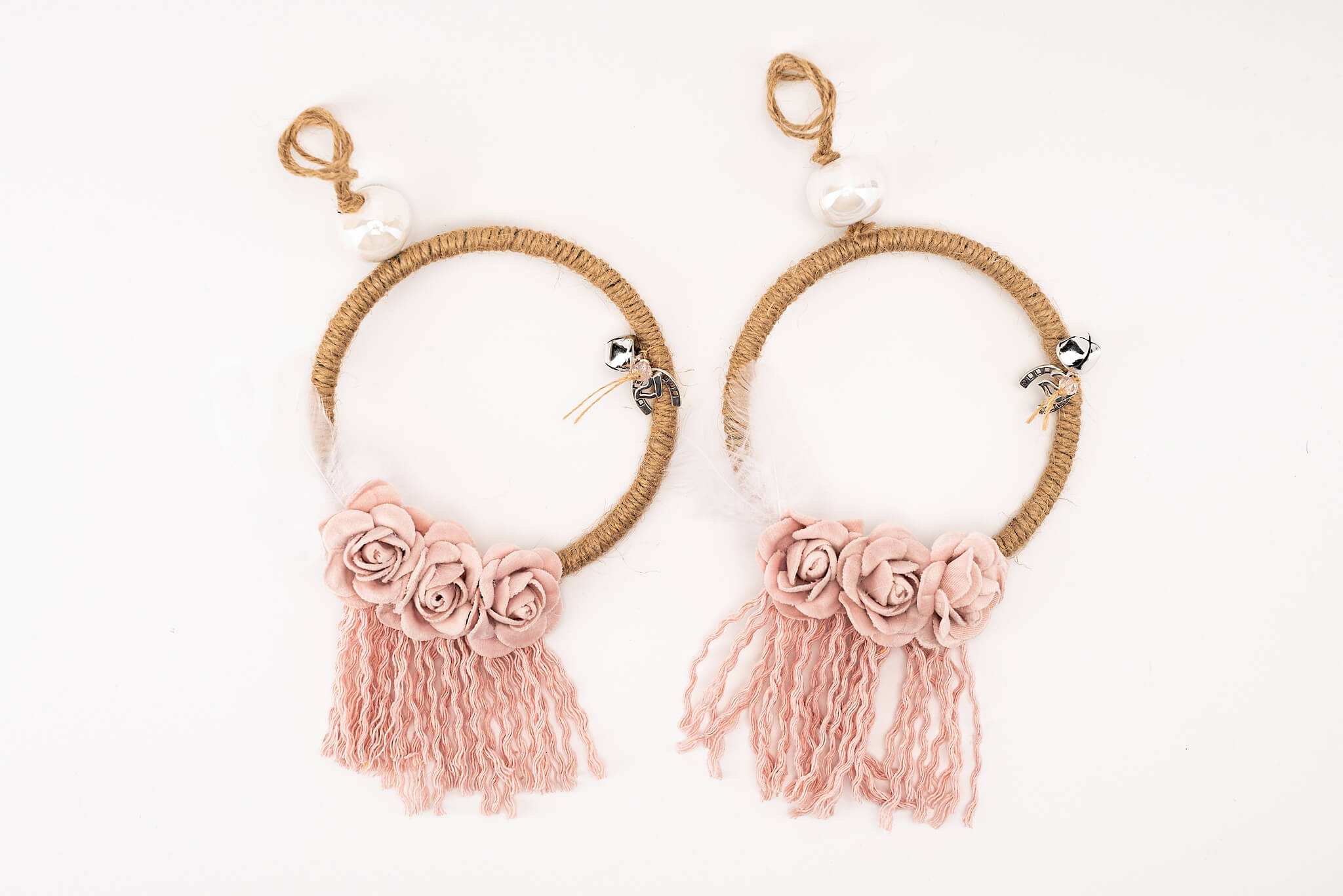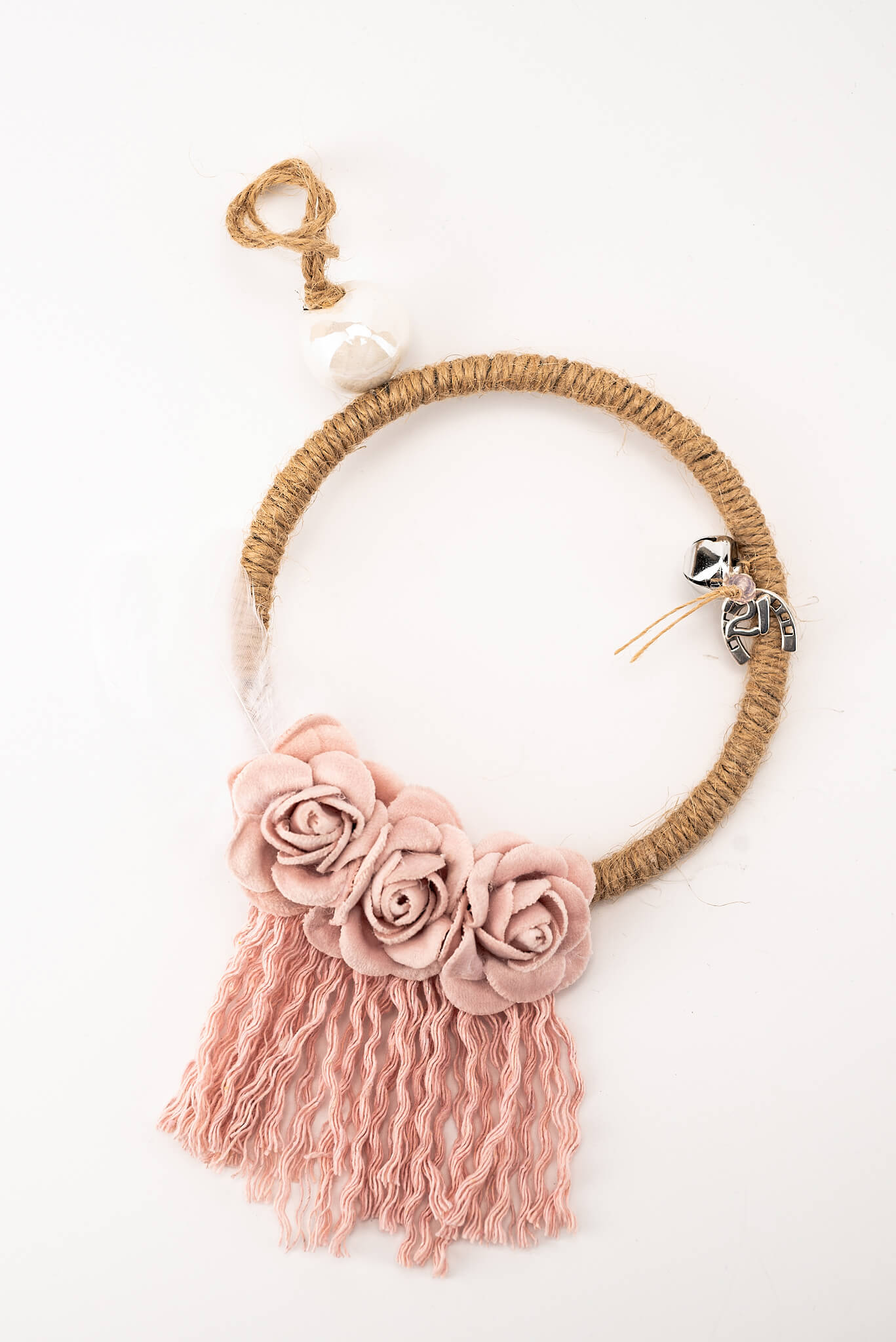 Χειροποίητο γούρι με στεφανάκι λινάτσας και ροζ τριαντάφυλλα