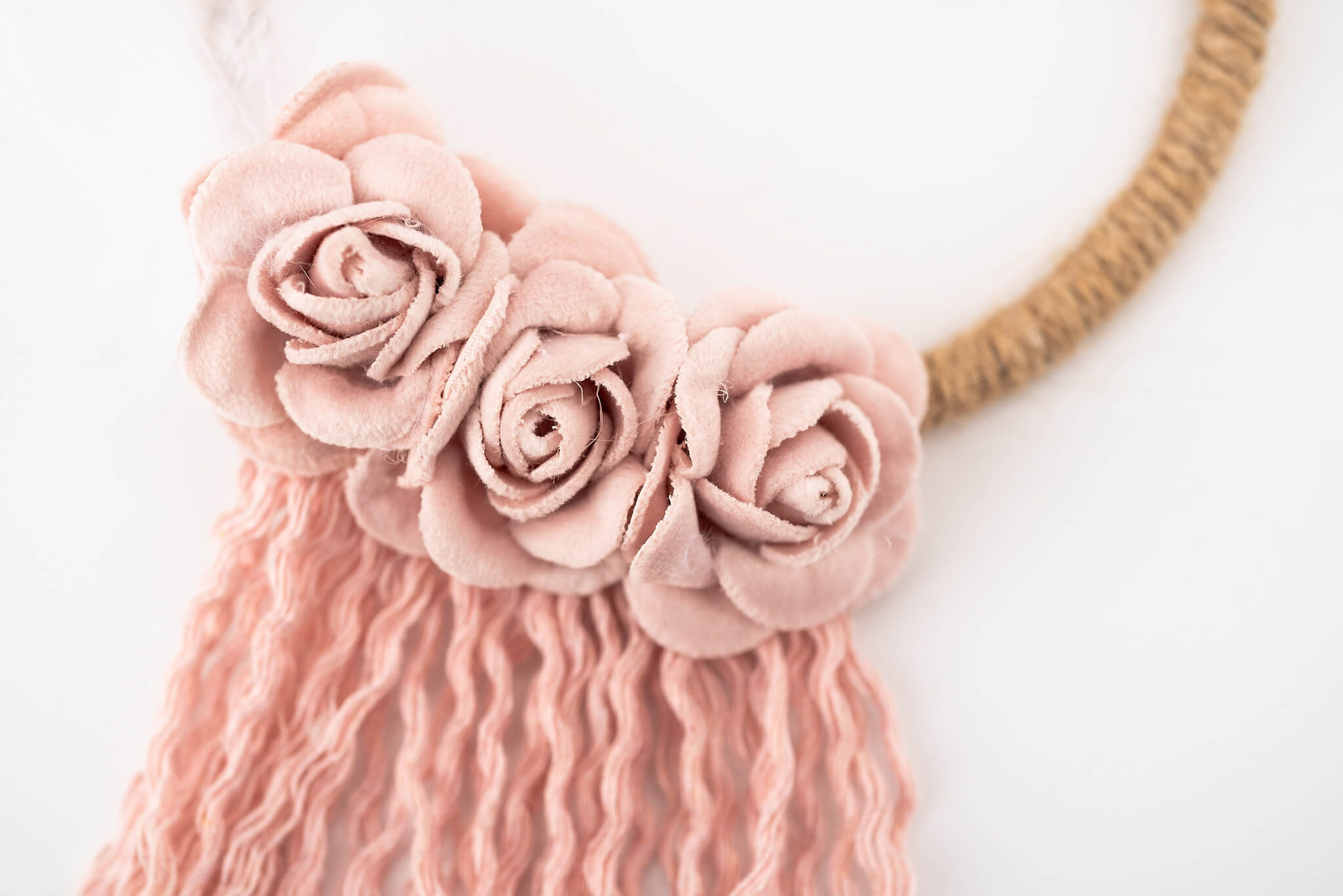 Κρεμαστό γούρι με στεφανάκι απο λινάτσα, ροζ βελούδινα τριαντάφυλλα και φτερά.
