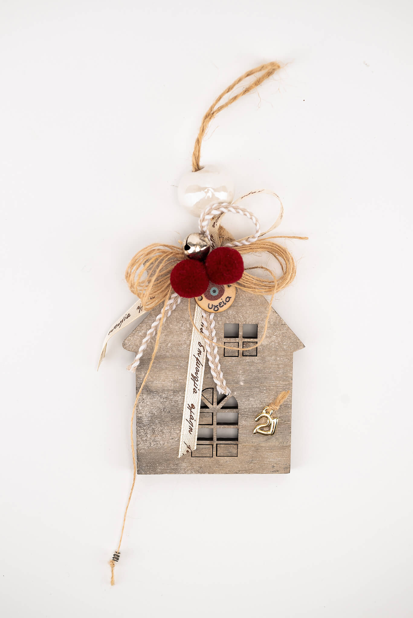 Χειροποίητο κρεμαστό γούρι σπιτάκι, με κορδέλες,πον πον και μεταλλικό κουδουνάκι