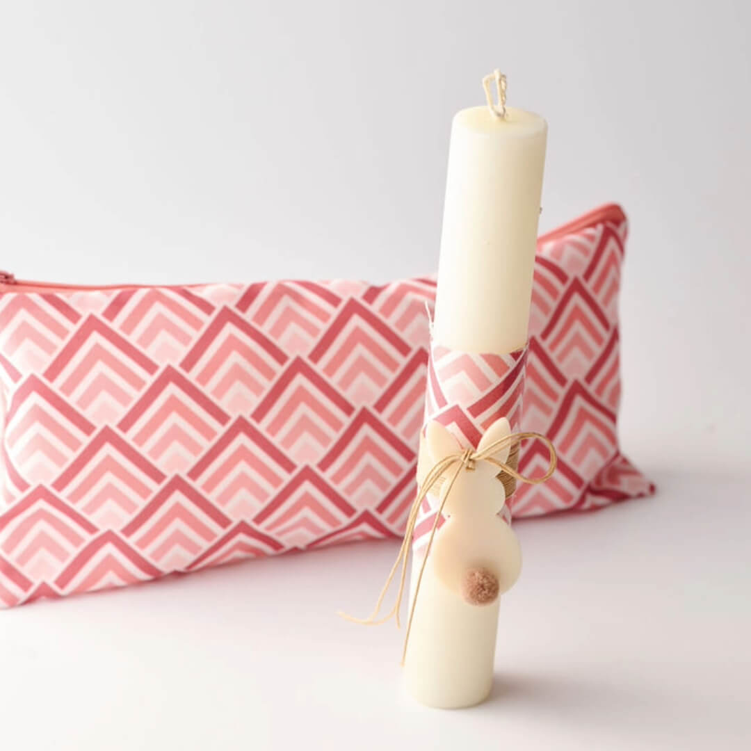 Για το φετινό Πάσχα επιλέξτε μια ιδιαίτερη χειροποίητη πασχαλινή λαμπάδα με διακοσμητικό λαγουδάκι και ασορτί υφασμάτινο νεσεσέρ! Μια παιχνιδιάρικη επιλογή που σίγουρα δεν θα περάσει απαρατήρητη. Η χειροποίητη πασχαλινή λαμπάδα, με αρωματικό κερί, θα φωτίσει τις πιο ξεχωριστές σας στιγμές ενώ το νεσεσέρ θα φυλάξει τα προσωπικά σας αντικείμενα με άνεση & στυλ! Ιδανικό για δώρο ή για προσωπική χρήση.