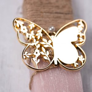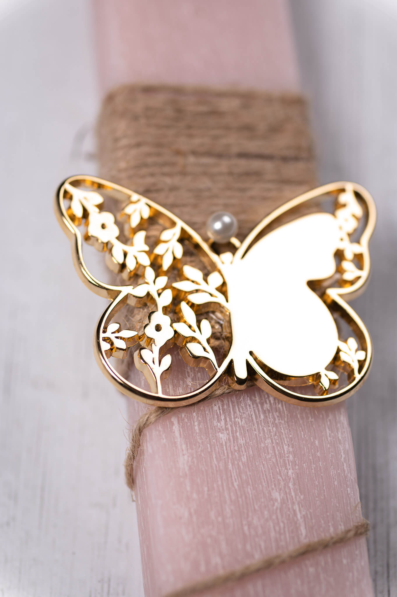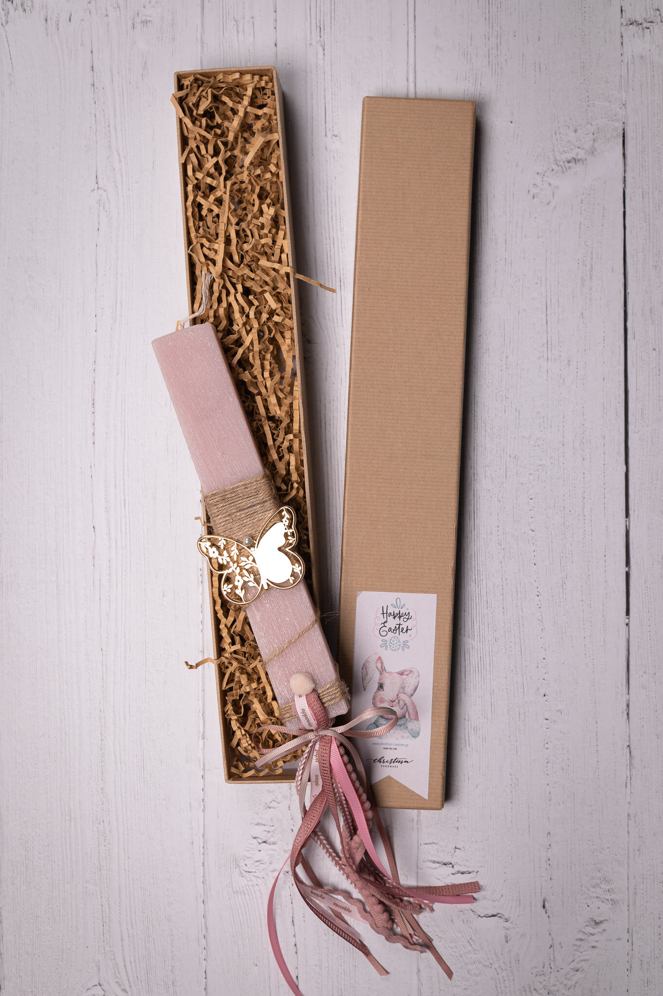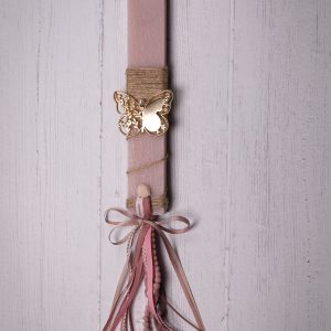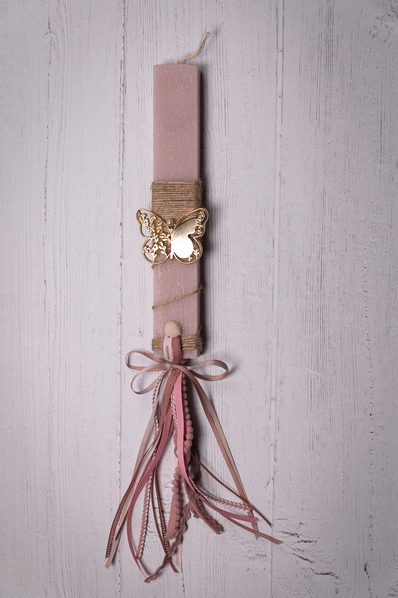Χειροποίητη πασχαλινή λαμπάδα με μεταλλική διακοσμητική πεταλούδα, πολύχρωμες κορδέλες & αρωματικό κερί.