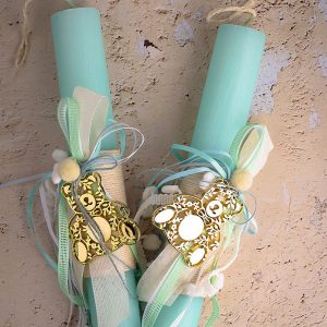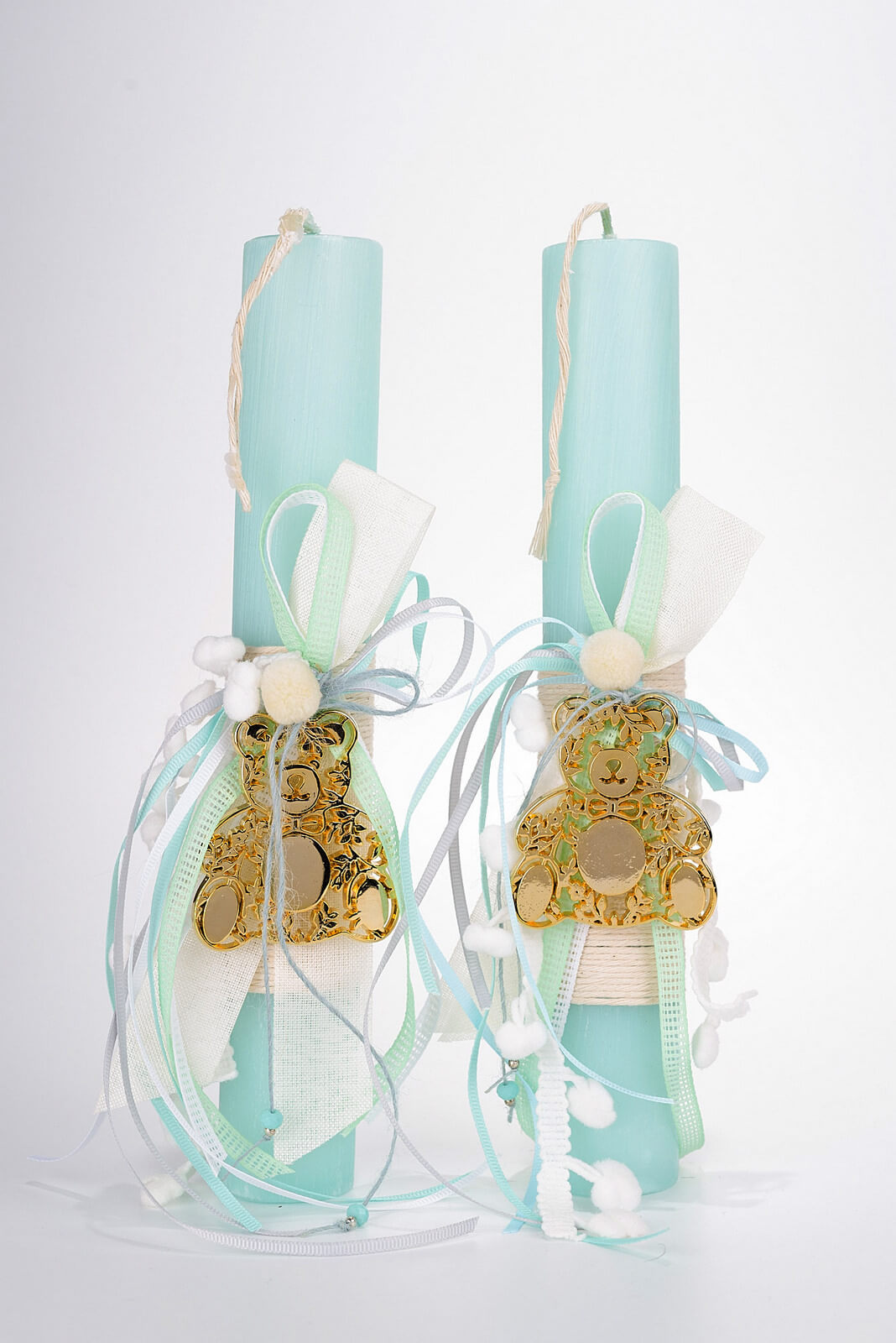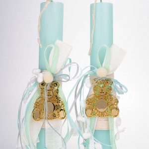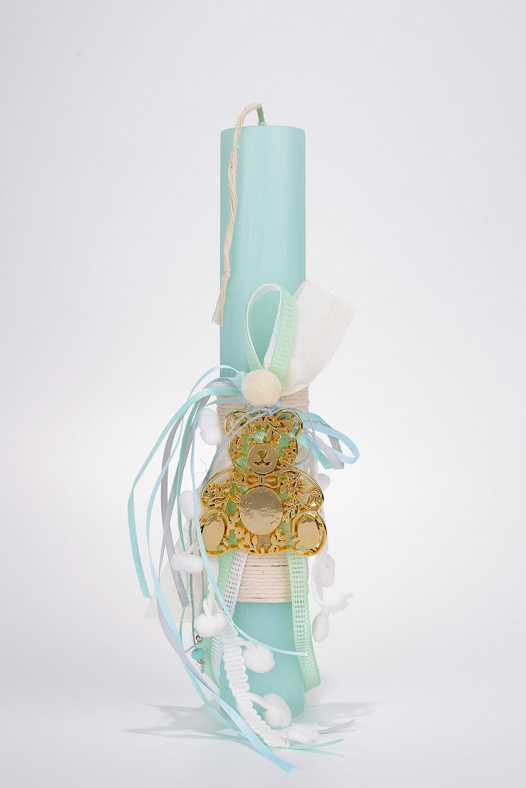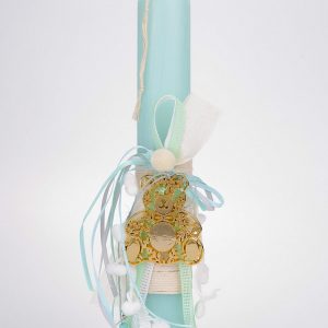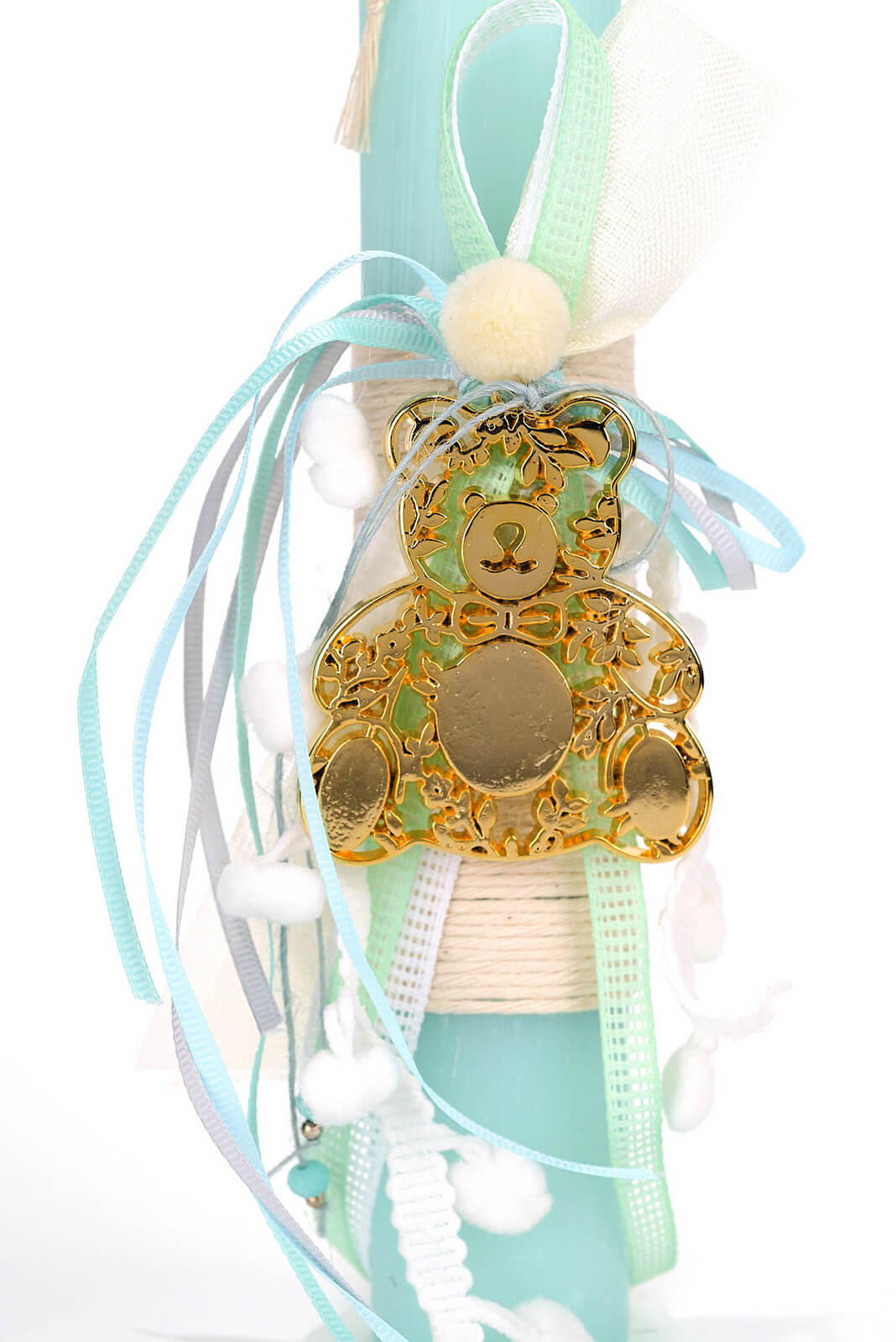 Χειροποίητα πασχαλινή λαμπάδα με μεταλλικό διακοσμητικό αρκουδάκι και στρογγυλό κερί .