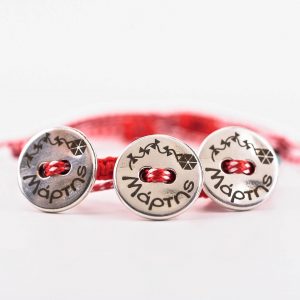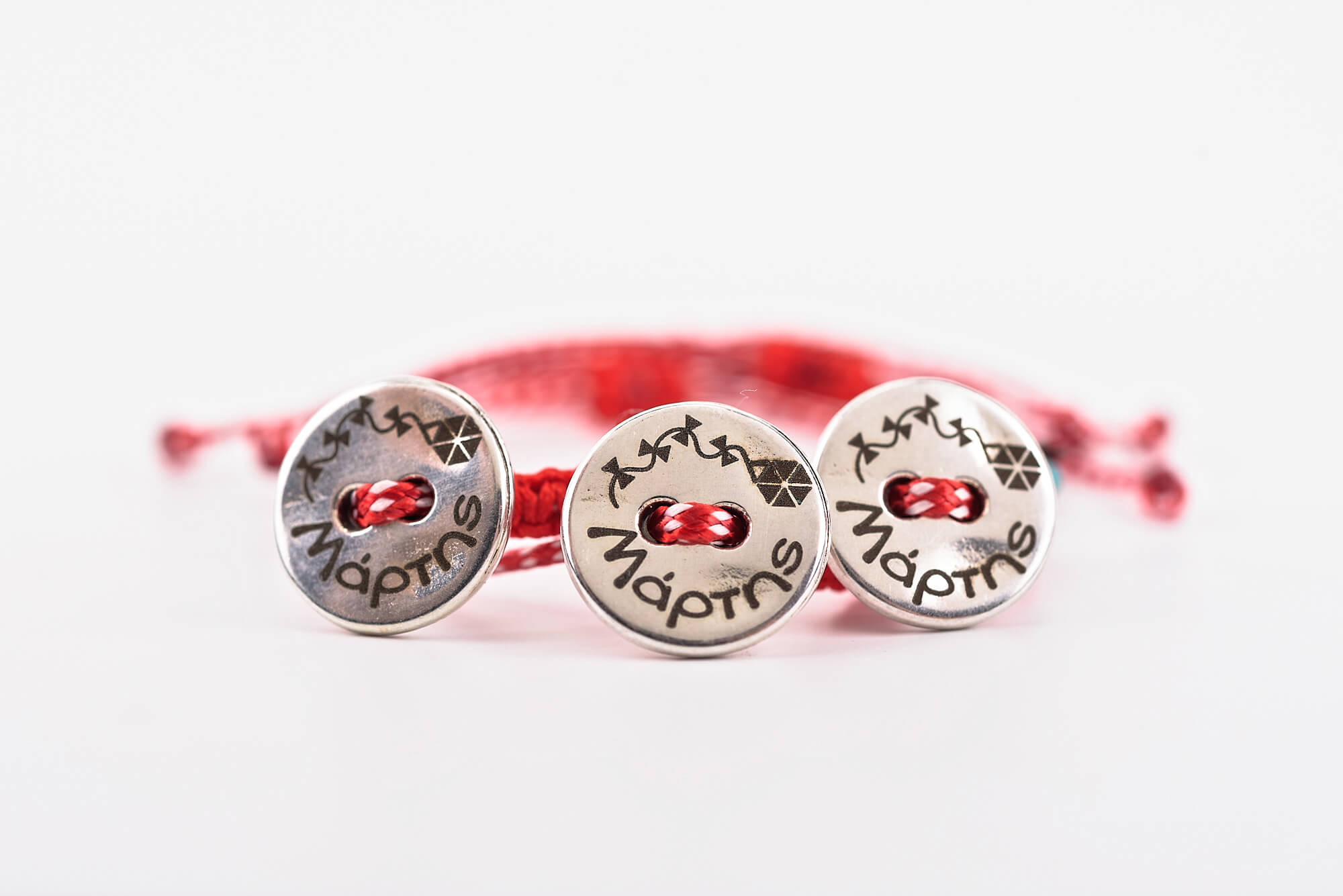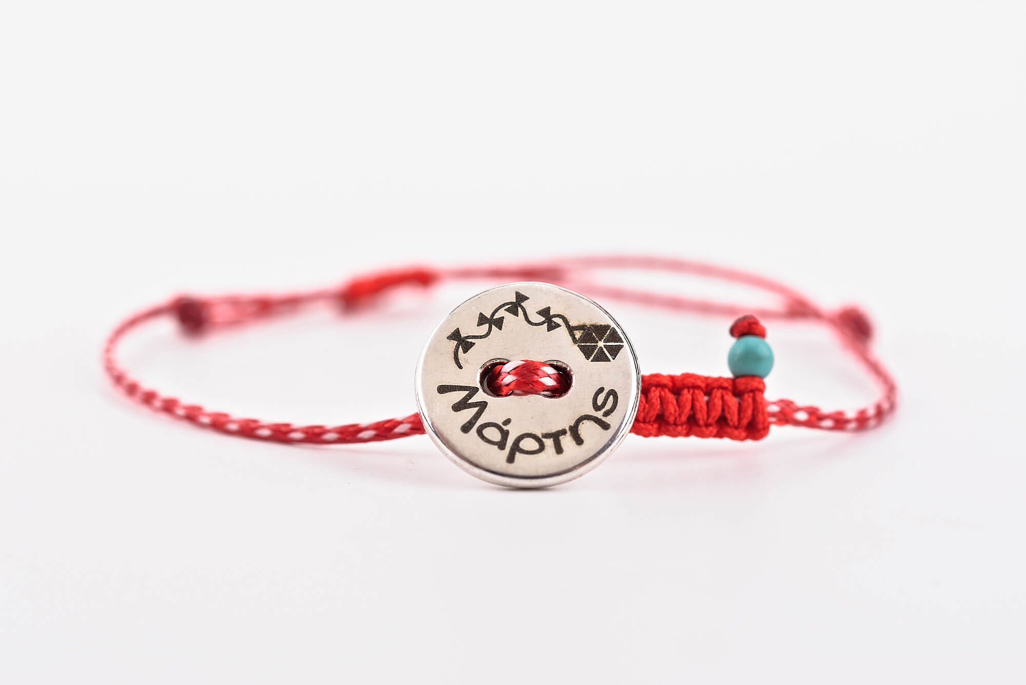 Υποδεχτείτε την πρώτη μέρα της Άνοιξης φορώντας ένα χειροποίητο βραχιόλι του Μάρτη. Φτιαγμένο απο βαμβακερό κορδόνι, με ασημένιο κουμπί & διακοσμητική mini χάντρα σε σιελ χρώμα