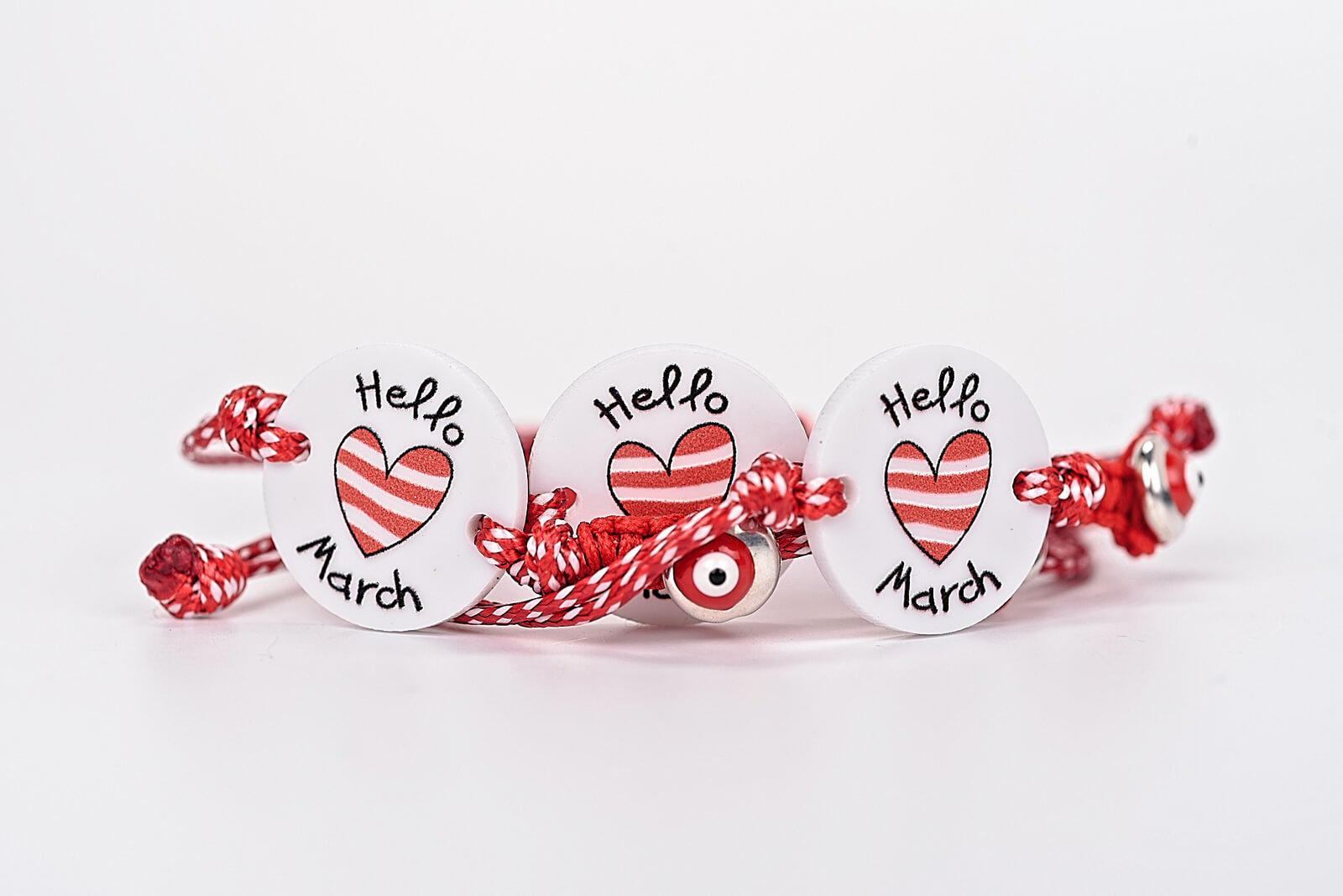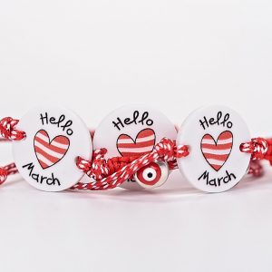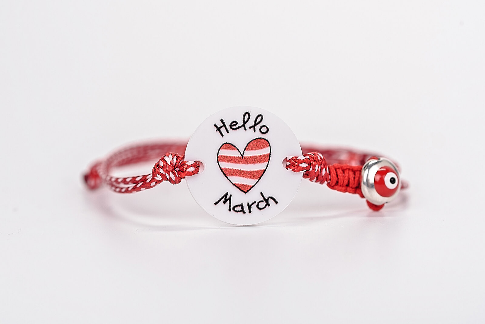 Υποδεχτείτε την πρώτη μέρα της Άνοιξης φορώντας ένα χειροποίητο βραχιόλι του Μάρτη. Φτιαγμένο απο βαμβακερό κορδόνι με στοιχείο απο plexiglass & διακοσμητικό μεταλλικό ματάκι.