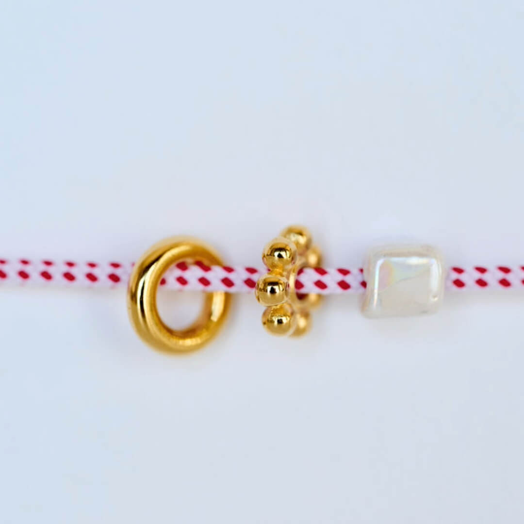 Φτιαγμένο απο βαμβακερό κορδόνι, επίχρυσα διακοσμητικά στοιχεία & λευκή κεραμική χάντρα.