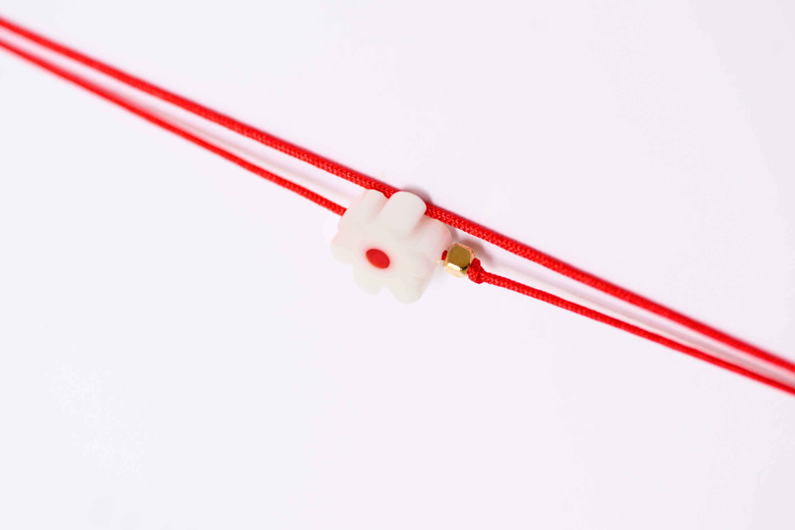 Φτιαγμένο απο βαμβακερό κορδόνι, επίχρυσα διακοσμητικά στοιχεία & λευκή χάντρα σε σχήμα μαργαρίτας.