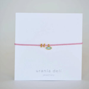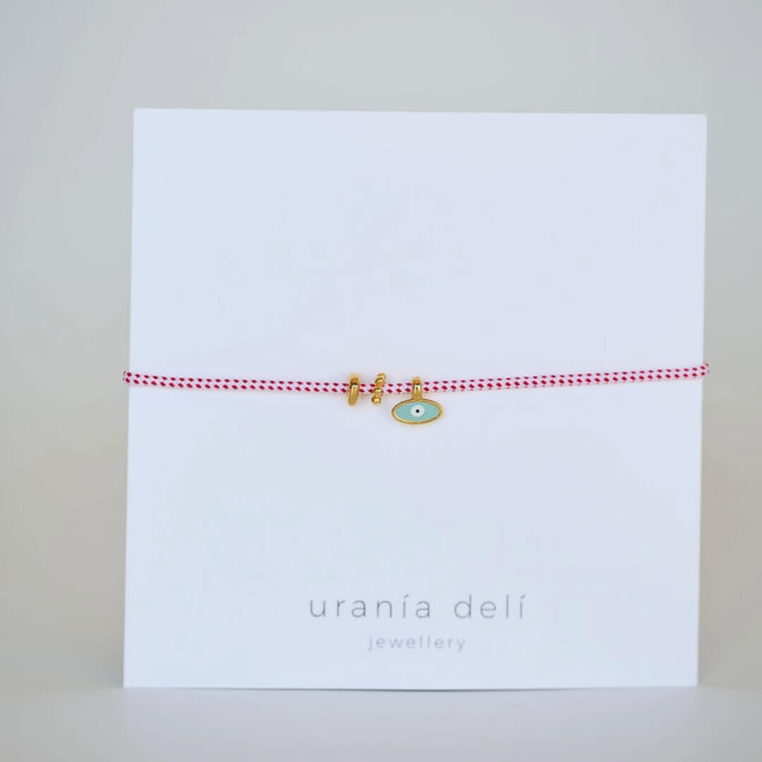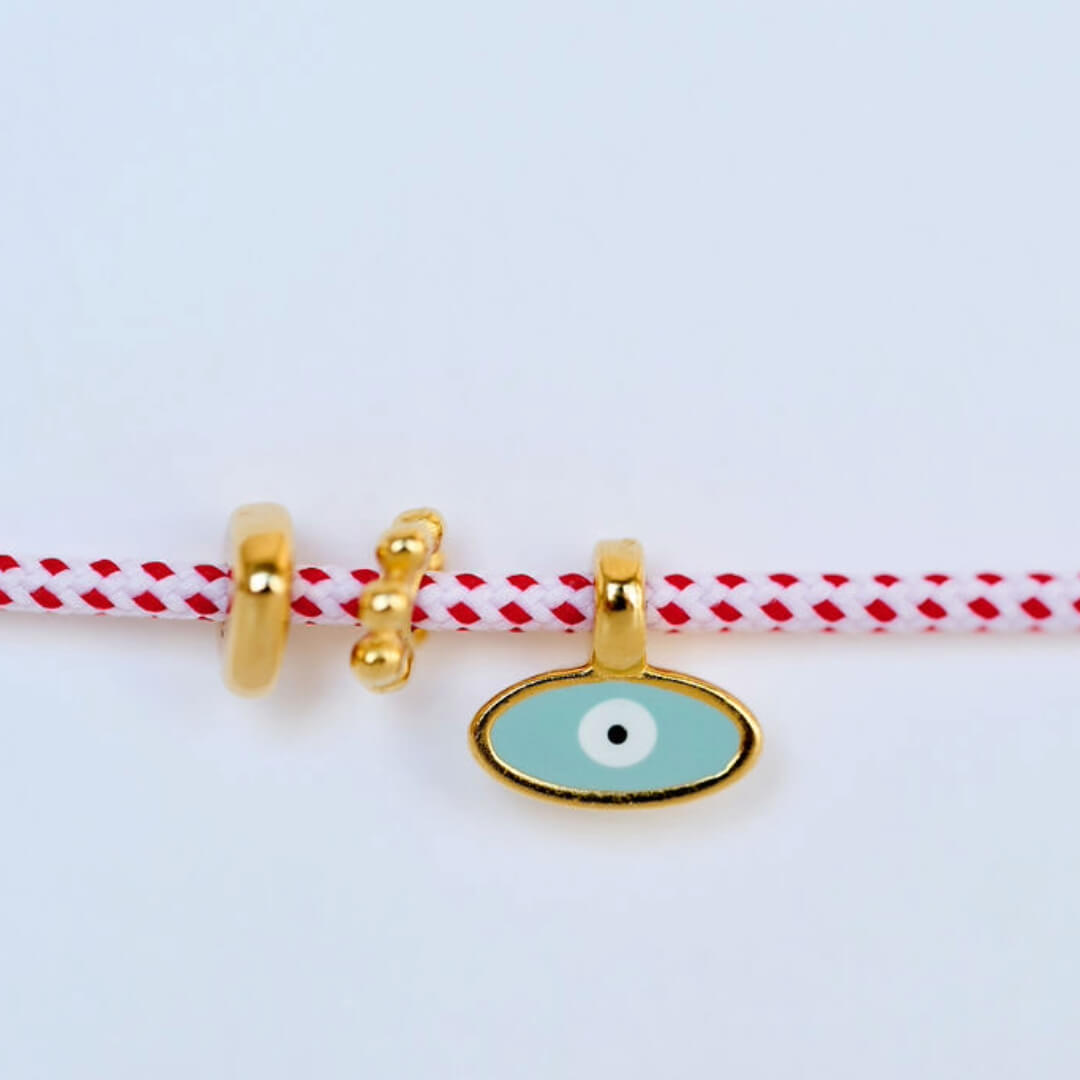 Φτιαγμένο απο βαμβακερό δίχρωμο κορδόνι, επίχρυσα στοιχεία & οβάλ γαλάζιο ματάκι.