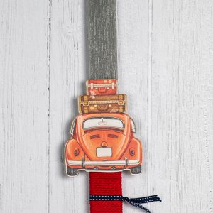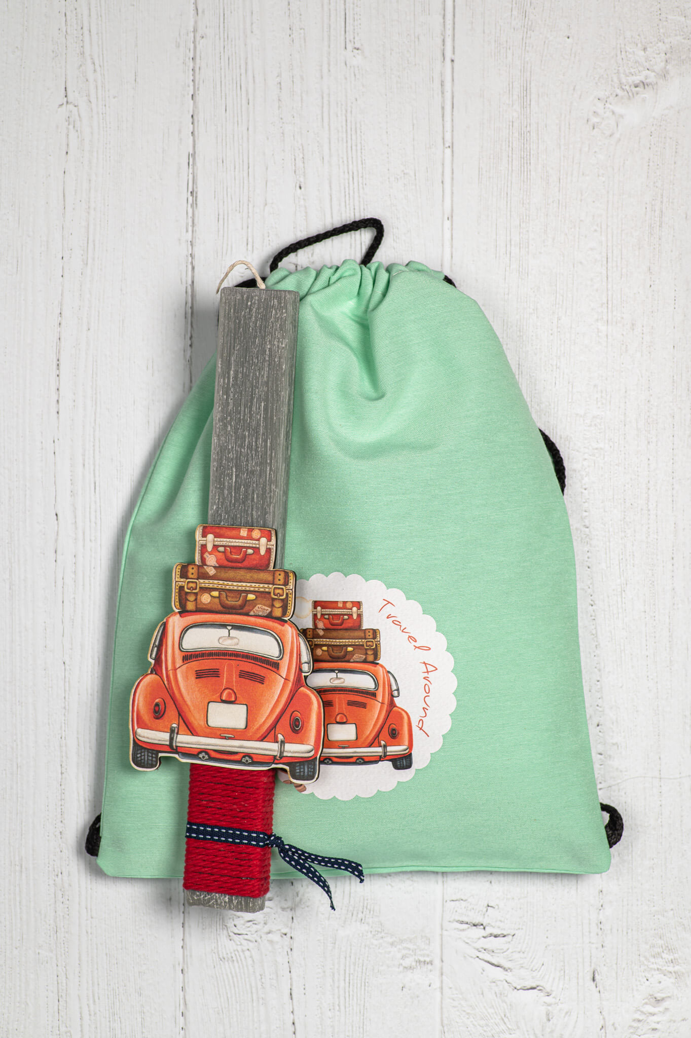 Χειροποίητη πασχαλινή λαμπάδα με ξύλινο διακοσμητικό αυτοκίνητο & ασορτί σακίδιο πλάτης.