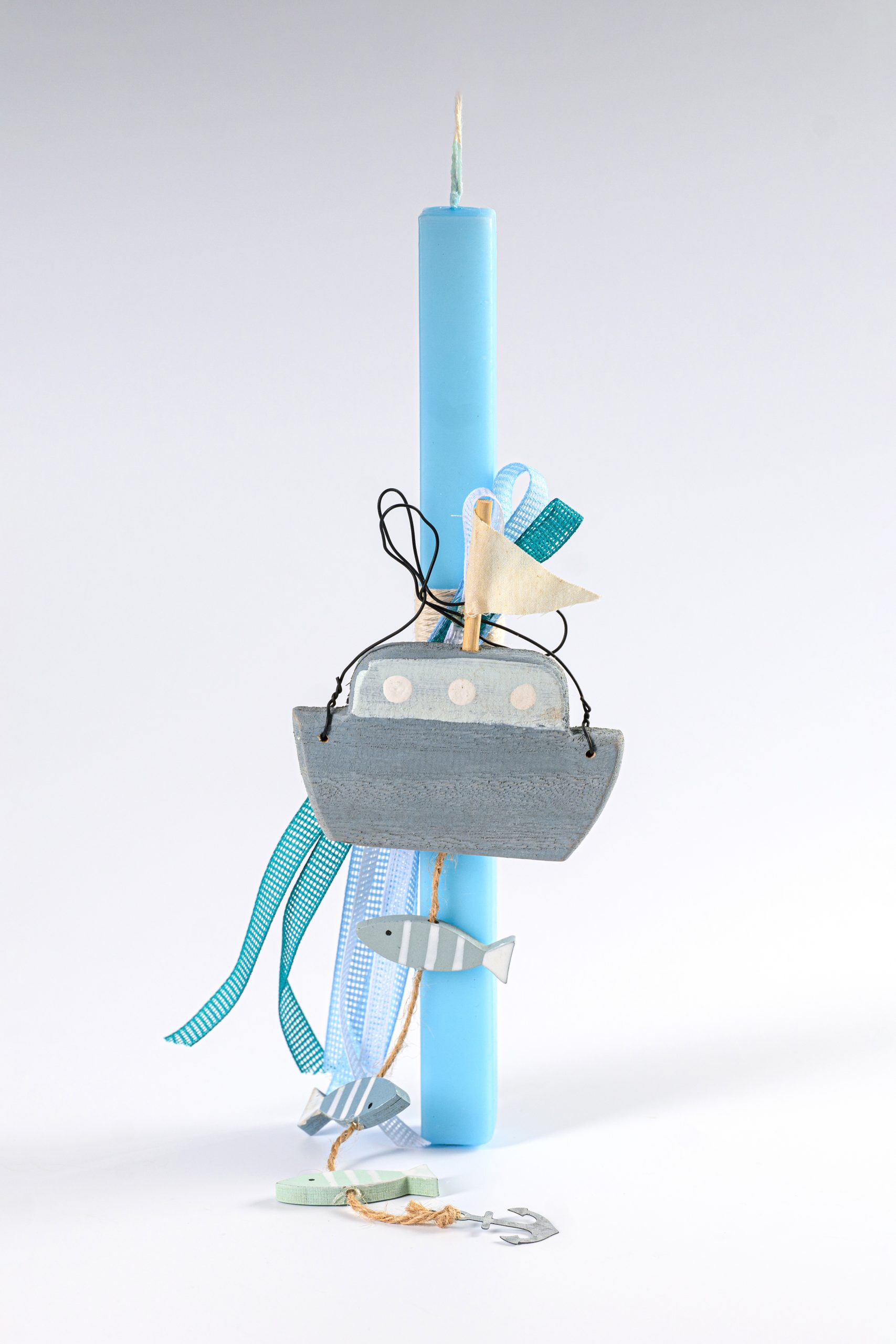 Χειροποίητη πασχαλινή λαμπάδα με ξύλινο διακοσμητικό καράβι & κρεμαστά ψαράκια.