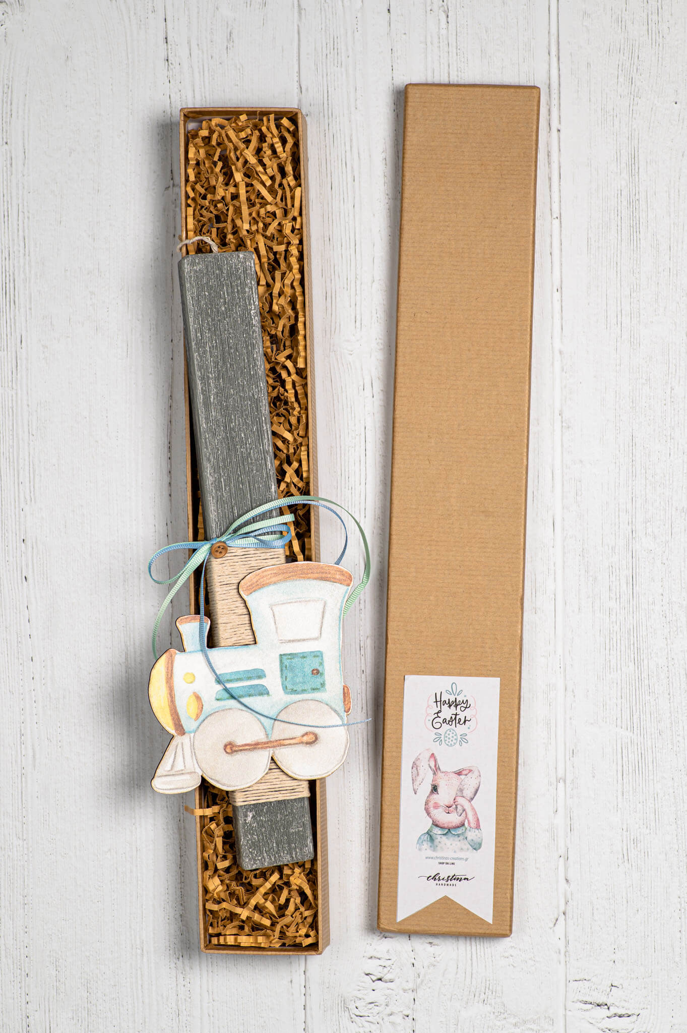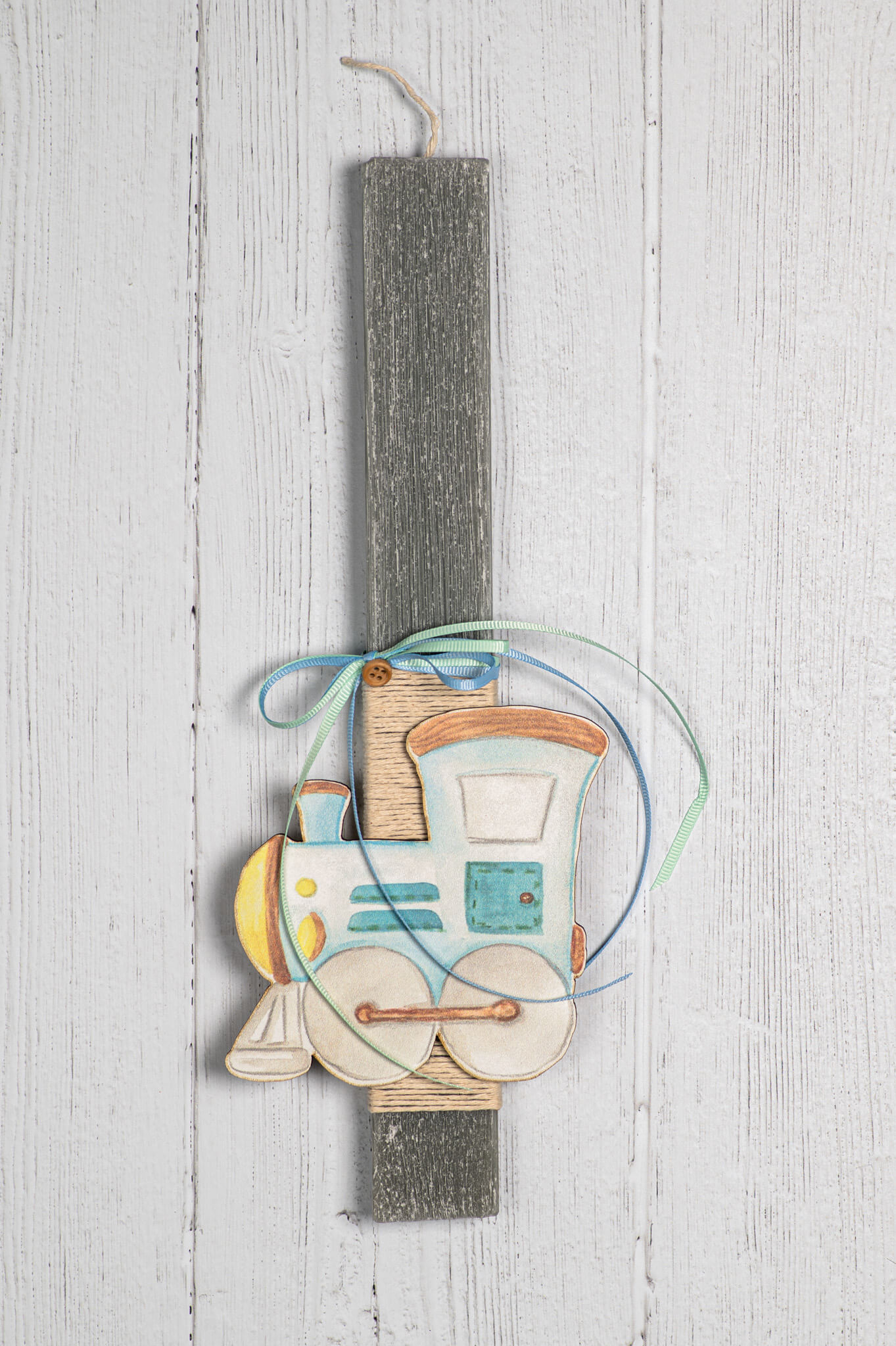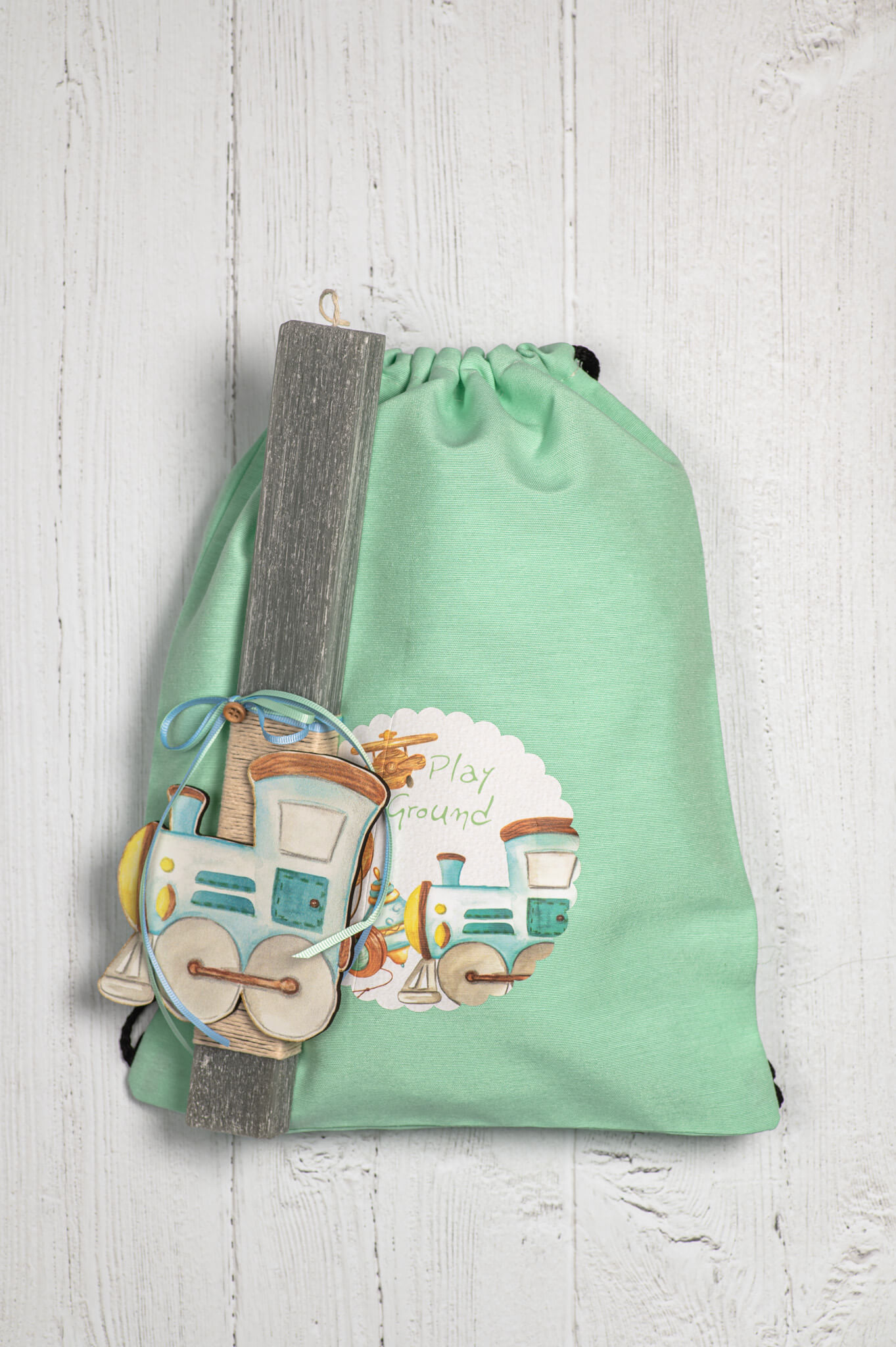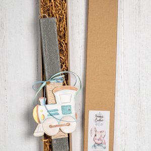Χειροποίητη πασχαλινή λαμπάδα με ξύλινο διακοσμητικό τρενάκι & ασορτί σακίδιο πλάτης.