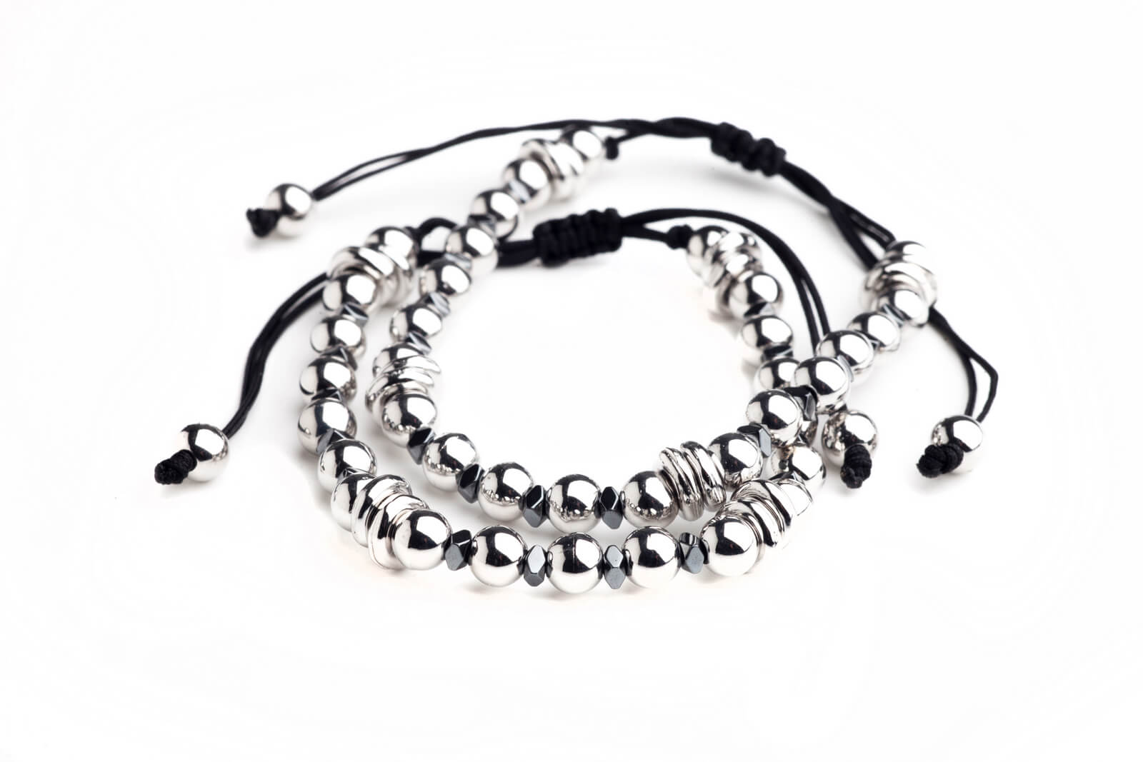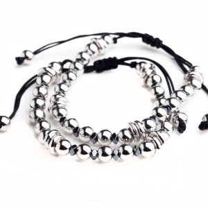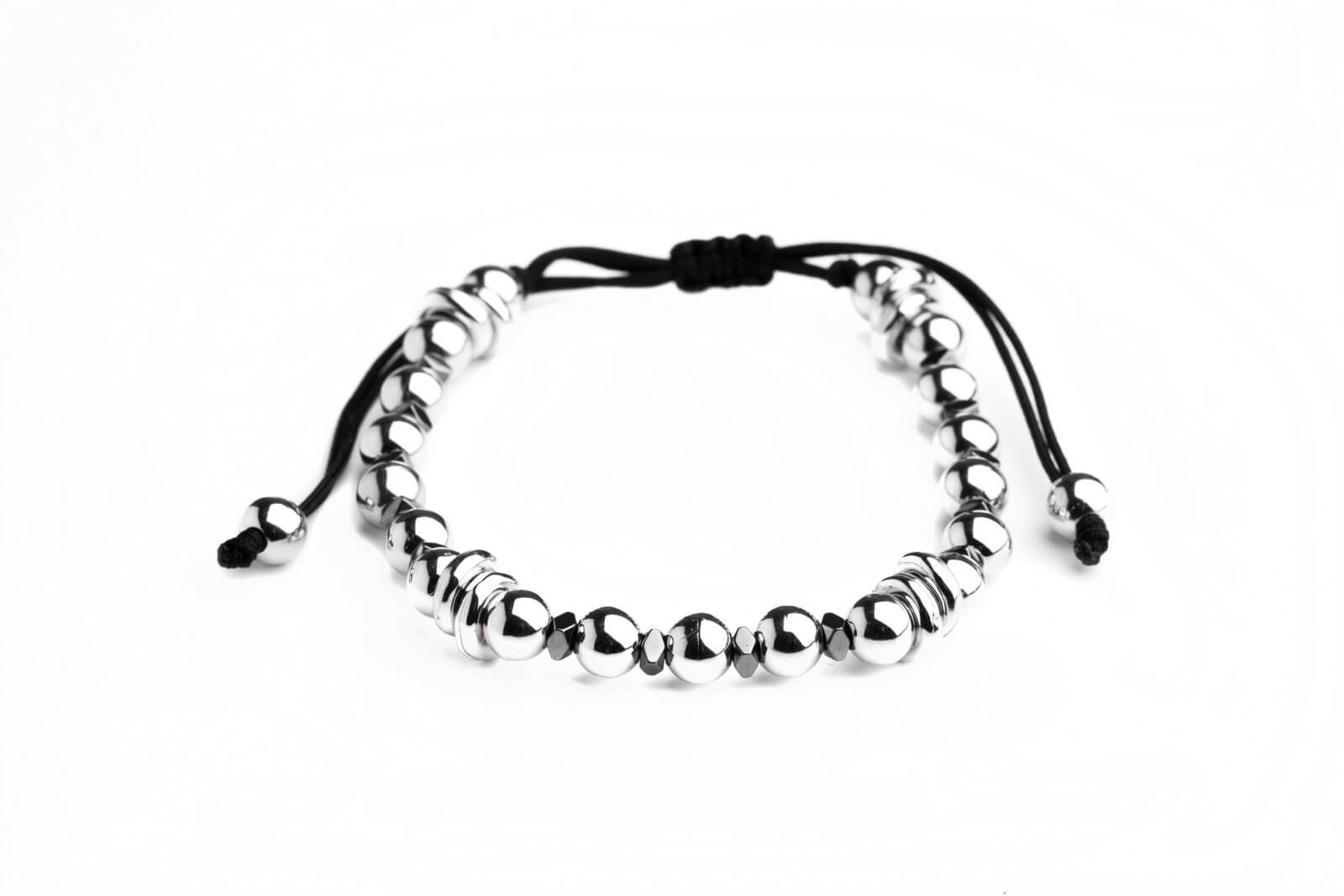 Χειροποίητο βραχιόλι με μεταλλικές χάνδρες σε ασημί απόχρωση, μαύρο κορδόνι και κλείσιμο με αυξομείωση.