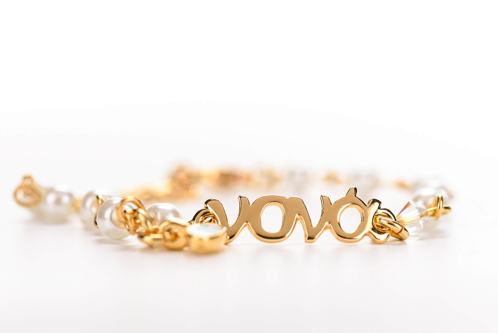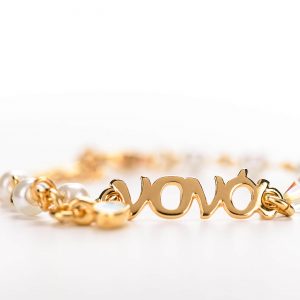 Χειροποίητο βραχιόλι με πέρλες σε λευκό χρώμα και μεταλλικό ματάκι.