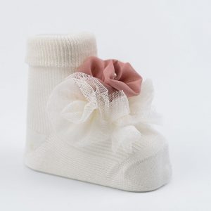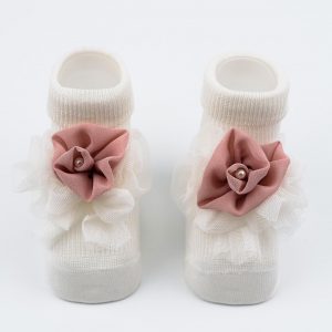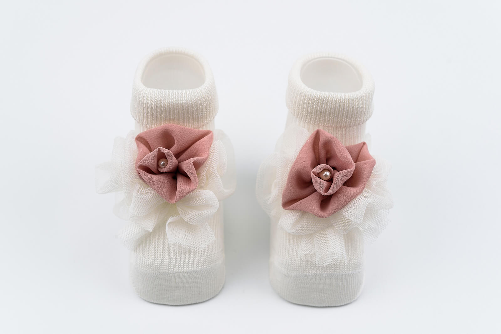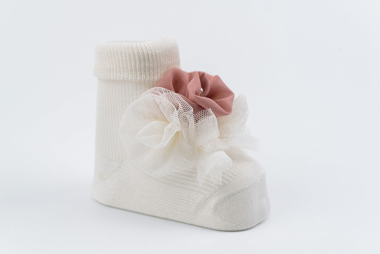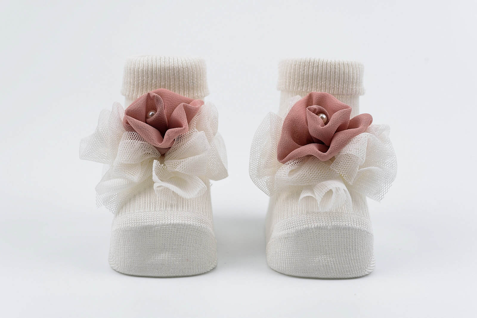 Βρεφικά καλτσάκια με διακοσμητικό λουλούδι στο πλάι απο οργάτζα και τούλι απο τη My little kiki.
