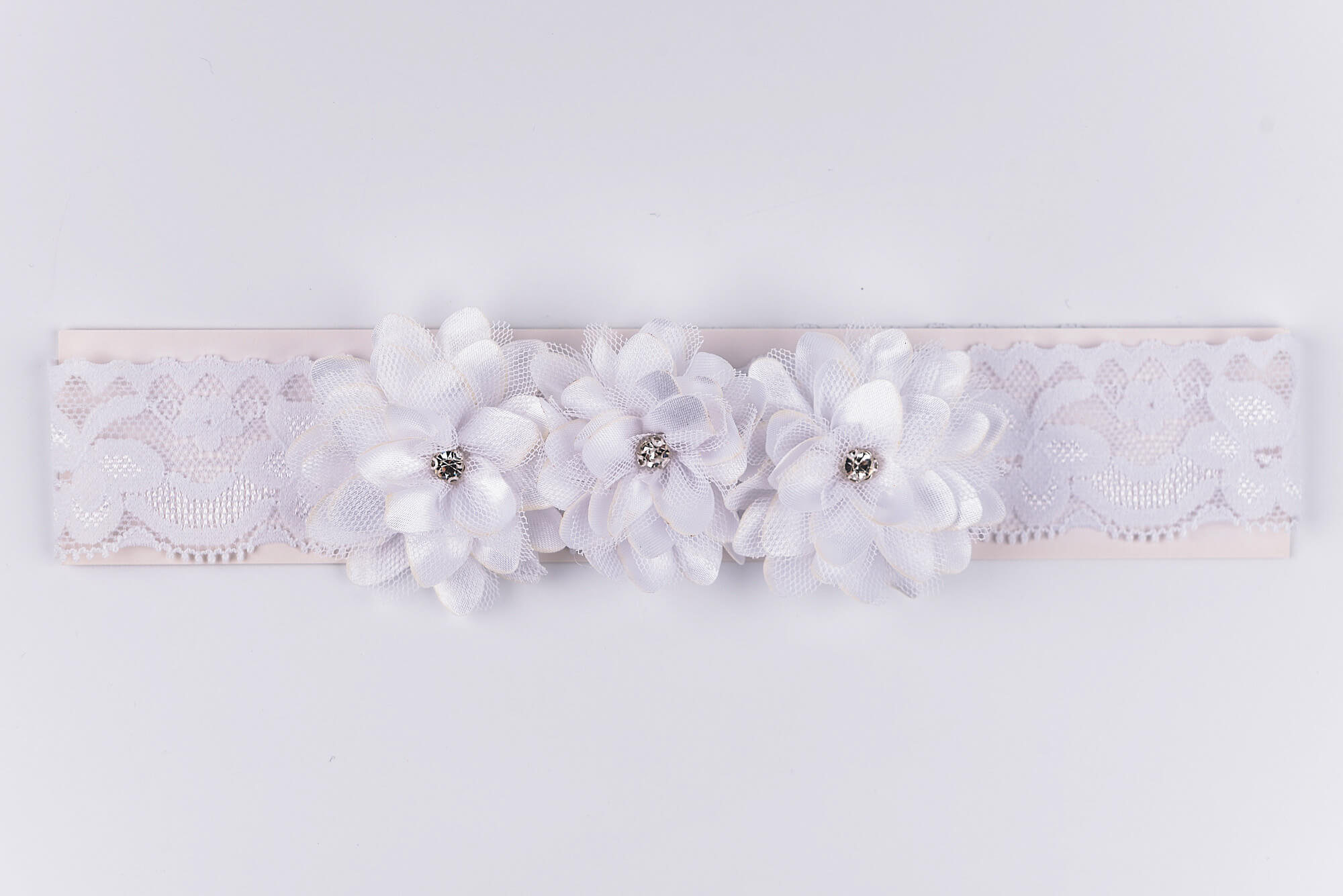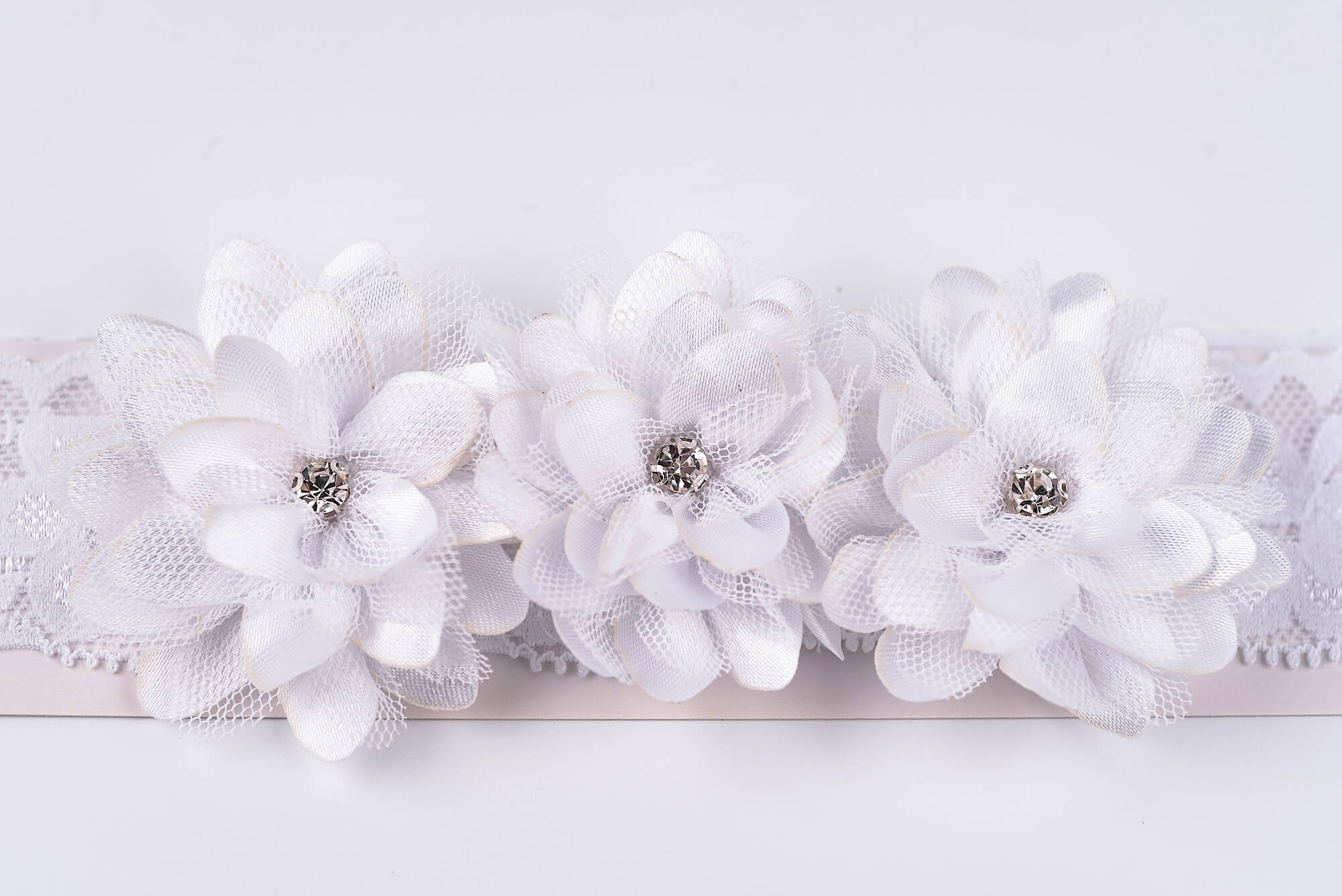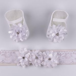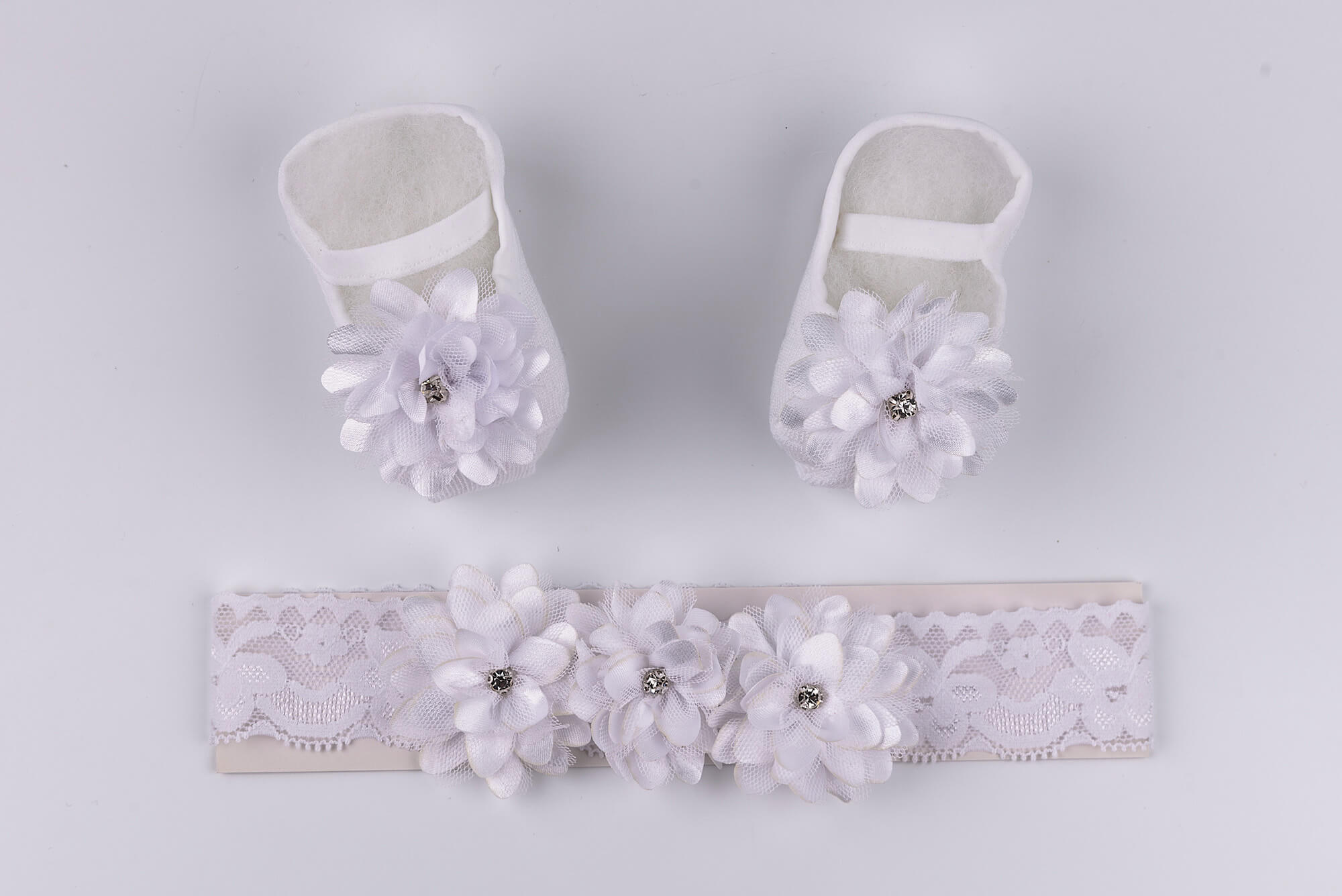 Χειροποίητη βρεφική κορδέλα μαλλιών απο βαμβακερή δαντέλα με διακοσμητικά λουλούδια και στρας.Συνδύασε τη με τα αντίστοιχα παπουτσάκια.