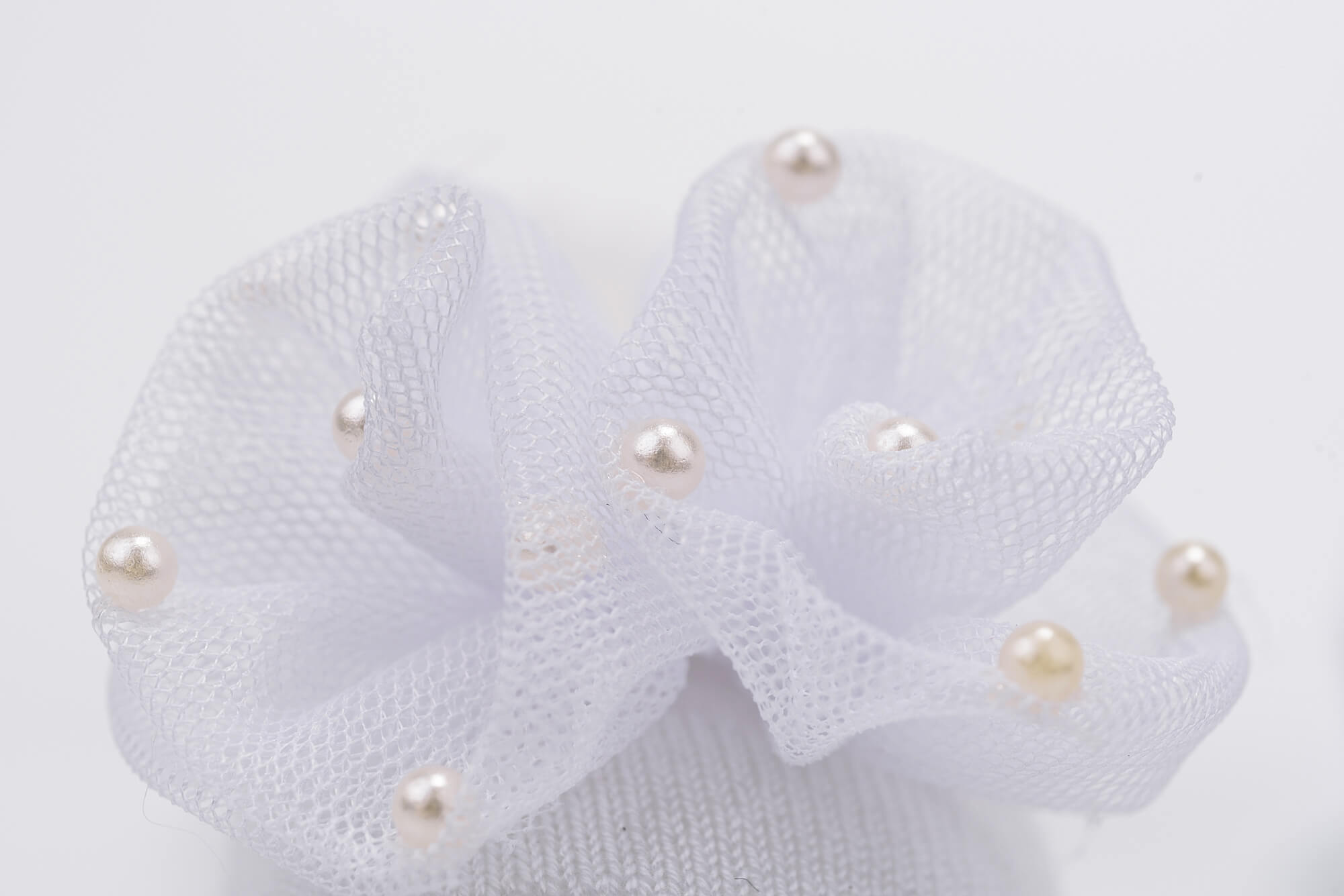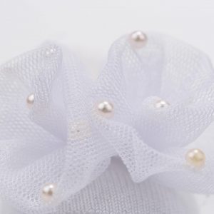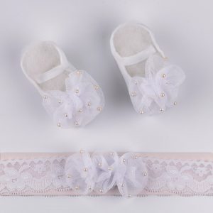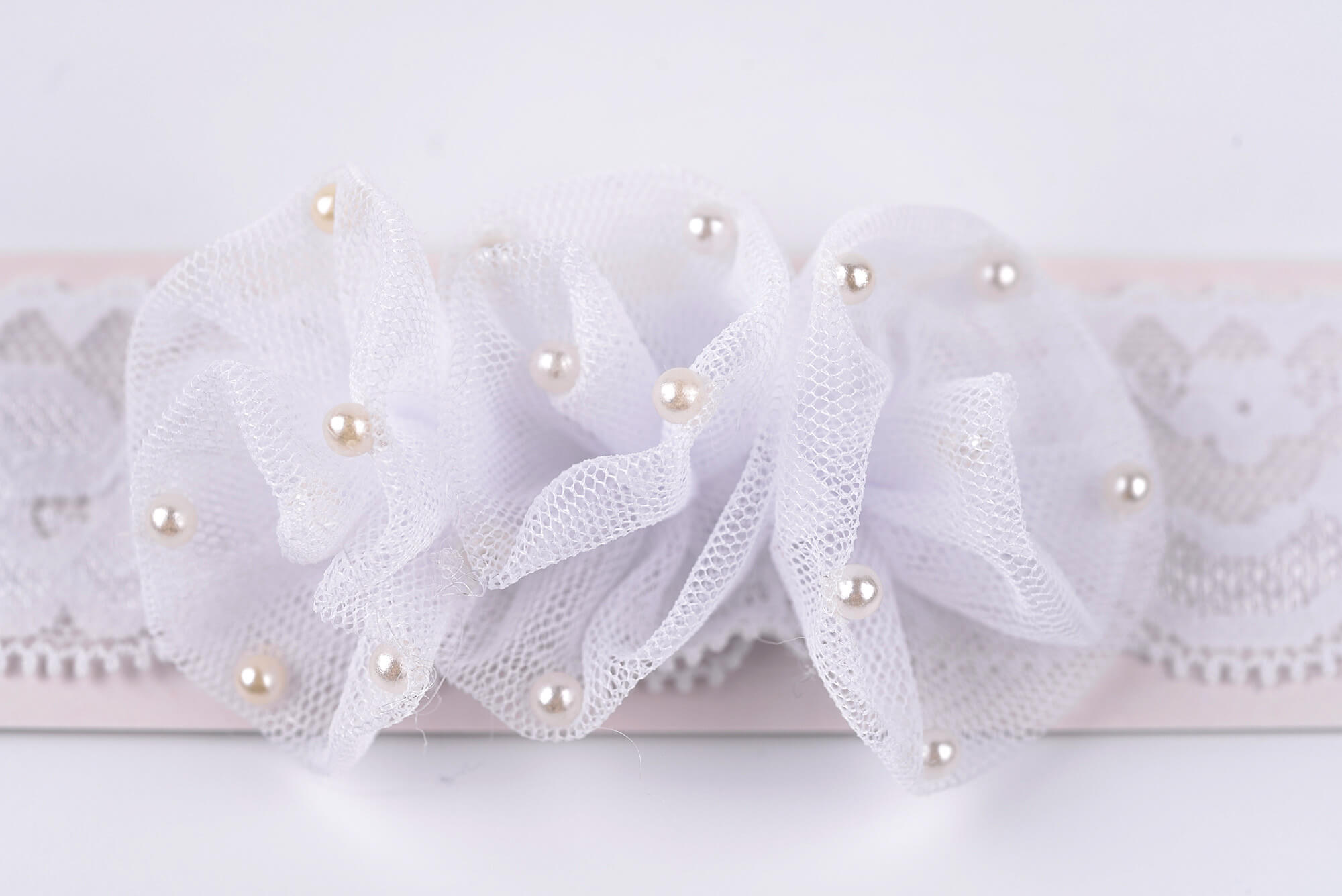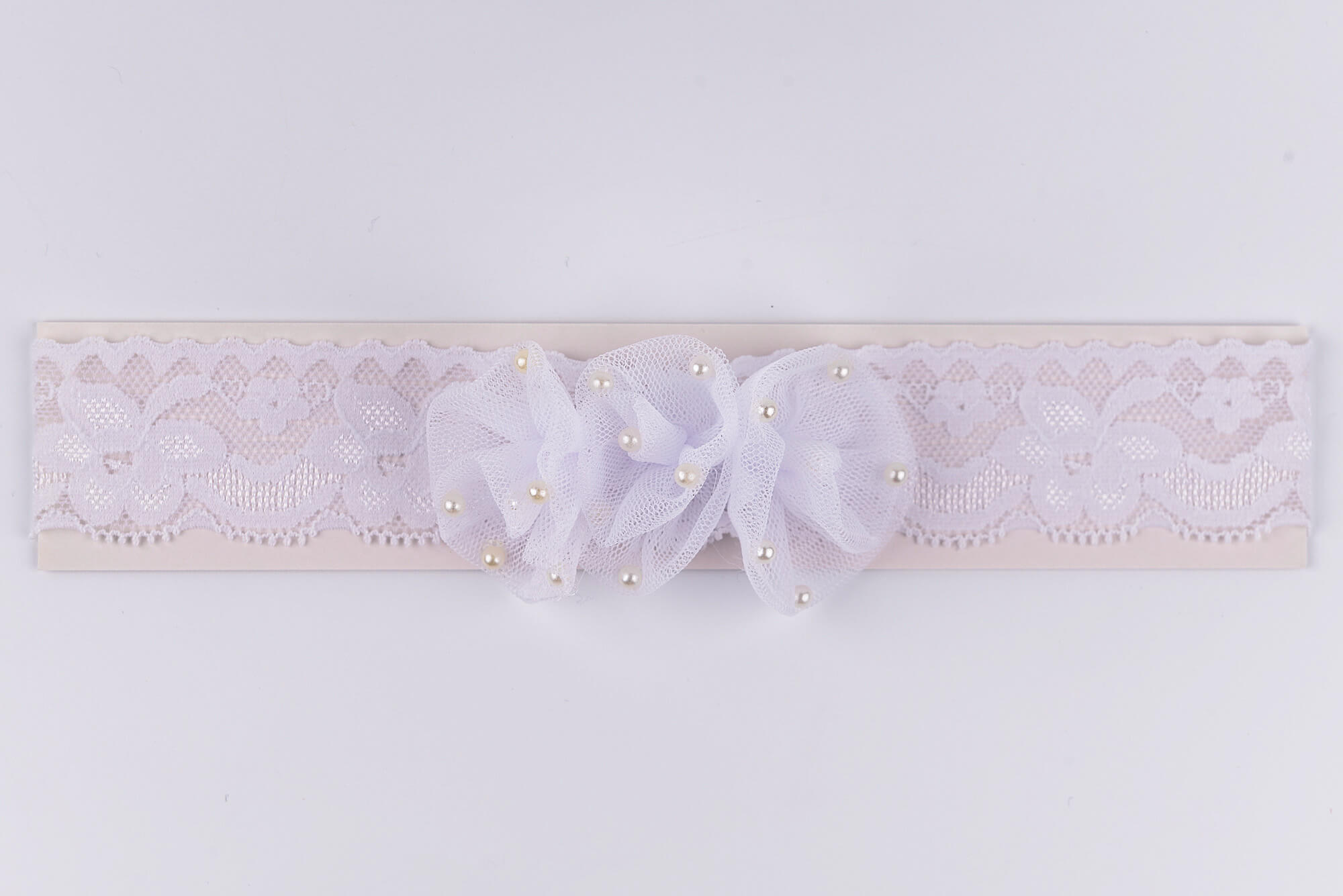 Χειροποίητη βρεφική κορδέλα μαλλιών απο βαμβακερή δαντέλα με διακοσμητικά λουλούδια και στρας.Συνδύασε τη με τα αντίστοιχα παπουτσάκια.